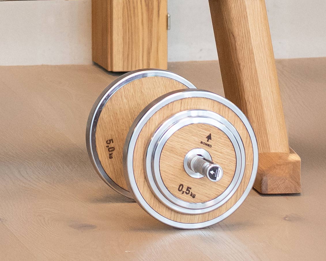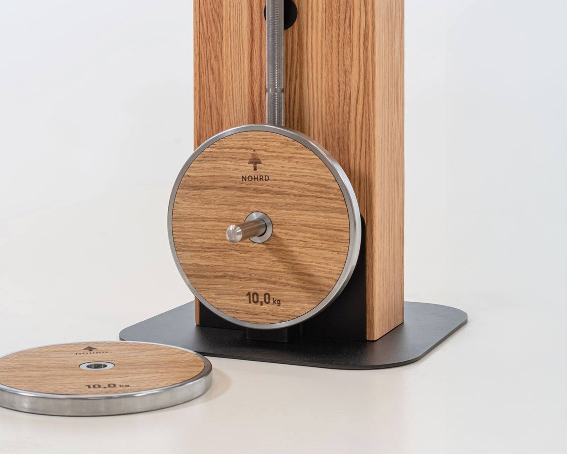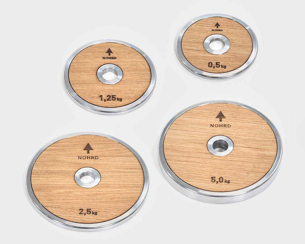 I vårt mål om å forene form og funksjon i et vakkert design, har vektskivene våre en naturlig trefinish, laget av ekte trefiner. Disse vektskivene er ikke bare vakre å se på, men har også en funksjonell fordel: Trefinéren fungerer som en buffer som eliminerer metallklangen når du monterer eller bruker vektskivene, noe som gir deg en bedre treningsopplevelse.