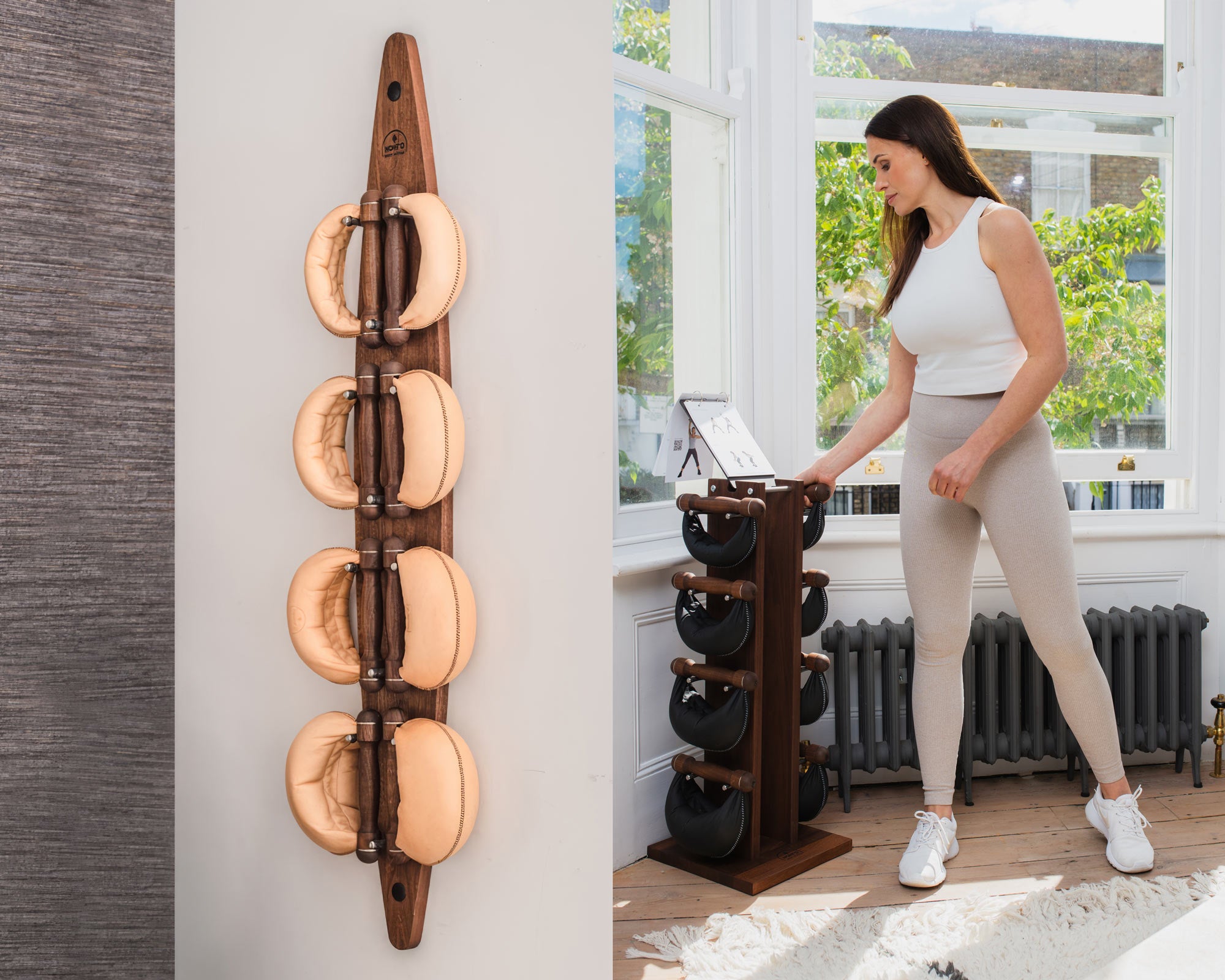 NOHRD SwingTower består av åtte SwingBells (sett med 2, 4, 6 og 8 kg) og et frittstående tårn for plassbesparende og elegant oppbevaring av manualene dine. Tilgjengelig i eik, valnøtt( 2 varianter), vintage eik eller svart.